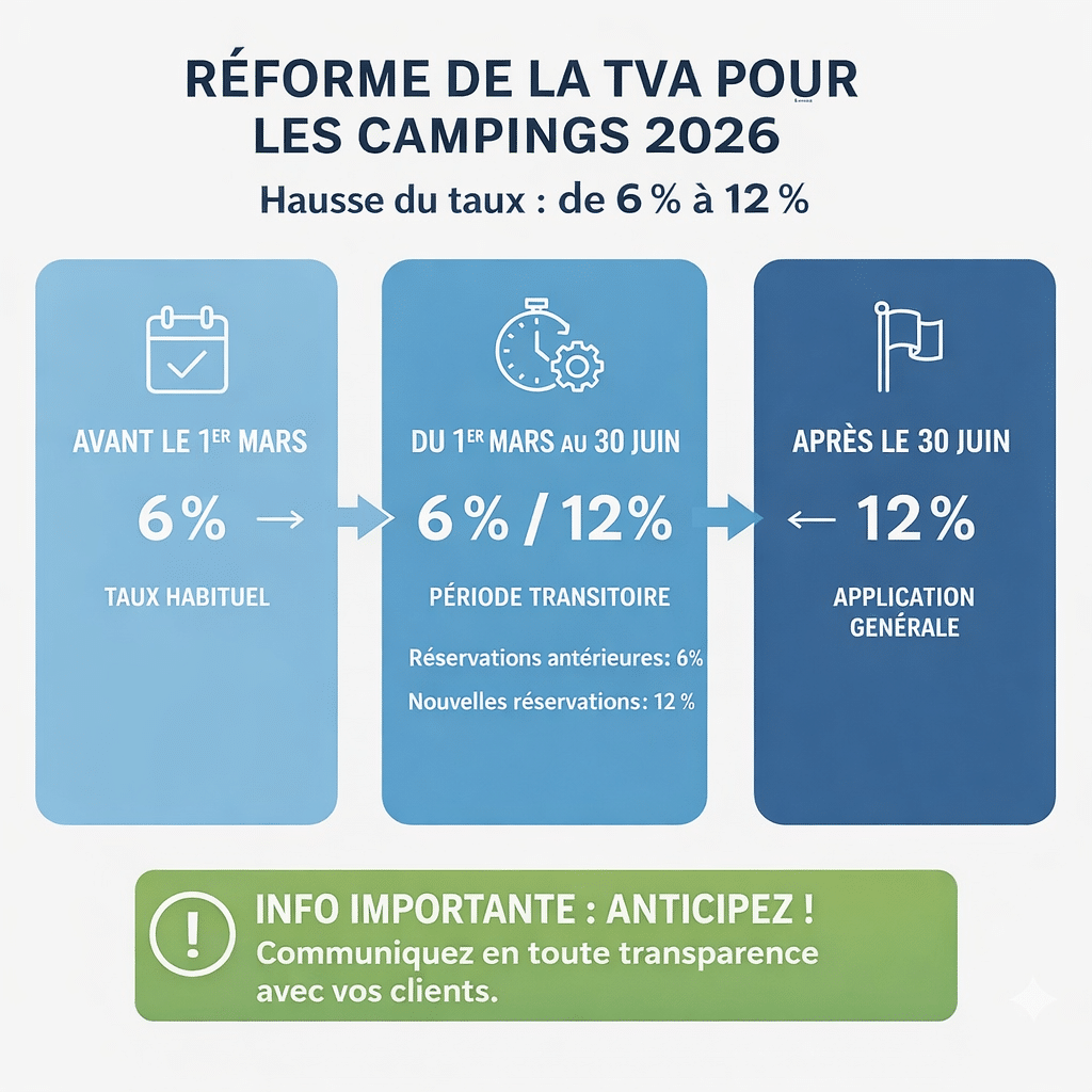 Ces services sont considérés comme accessoires de la prestation principale (emplacement de camping) et suivent donc le même taux de 12% de TVA à partir du 1er mars. - Exemple : Un séjour a été réservé par une famille le 15.02.2026. Un acompte de 30 euros a été payé le 28.02.2026 et le solde de 70 euros sera payé à la fin du séjour, soit le 03.05.2026. Quel est le taux de TVA applicable ?La TVA sur l’acompte devenant exigible le 28.02.2026, à savoir avant l’entrée en vigueur du nouveau taux de TVA, le taux de 6 % reste de toute façon applicable au montant de 30 euros. Lorsque le solde est payé à la fin du séjour (le 03.05.2026) et que la TVA devient exigible sur 70 euros, le taux de 12 % serait, en principe, applicable (selon les règles légales). Toutefois, compte tenu de la date de réservation (le 15.02.2026) qui se situe avant le 01.03.2026, une mesure transitoire (voir FAQ n° 15) est d’application et le solde peut également être soumis au taux de 6 %.